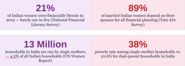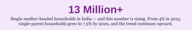 - Only 26% of single mothers in India receive an independent income — the majority remain financially dependent on extended family or male relatives (UN Women)